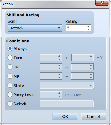 - The HP of the enemy will be used as a condition. Specify the range of the percentage of Max HP (0 to 100%). The condition will be met when the enemy's HP is within the specified range.