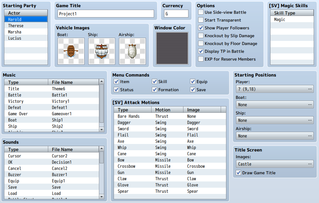 System data is the collection of things such as the initial settings for the game. You can specify things such as the formation and positions of party members at the start of the game, and the music that places in various situations during gameplay.