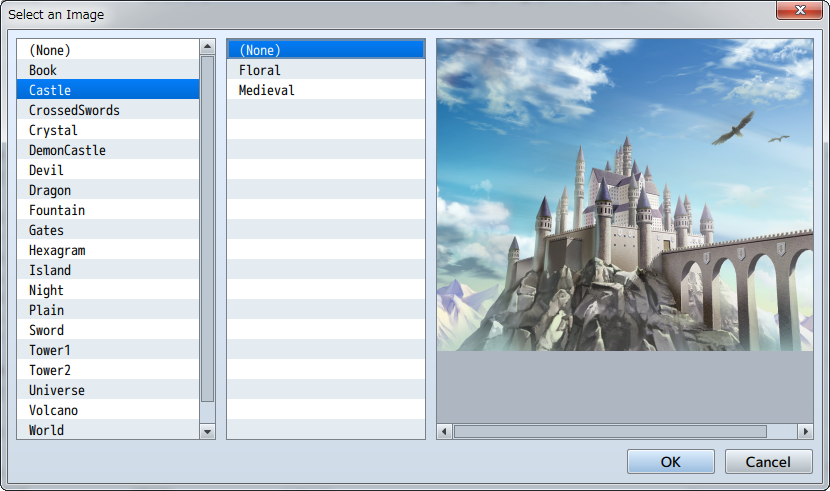 The image which is displayed first in the Play Screen after starting the game. You can select an image in the [Select an Image] window that appears by pressing the field's [...] button. When [Draw Game Title] is enabled, the game's name that was specified in [Game Title] will be displayed towards the top of the Title Screen (disable when including the title of the game in the image).