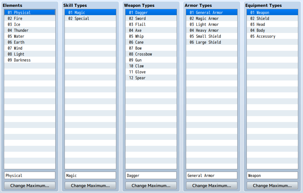 Types are the collection of name parameters of game elements, skill types, weapon types, armor types, and equipment types. The types configured here will be reflected in the Type section for each settings window.