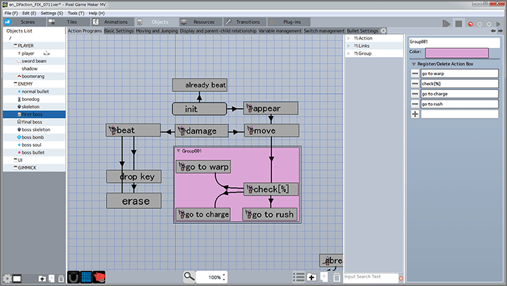 In Pixel Game Maker MV, you can complete your own original action game without doing any programming at all. Since it's an intuitive and easy-to-use tool that uses a flow chart-style system, even a beginner can have fun making games with it. However, you can also use it to create games that are as complex as you like by mastering skills such as adding features in JavaScript.