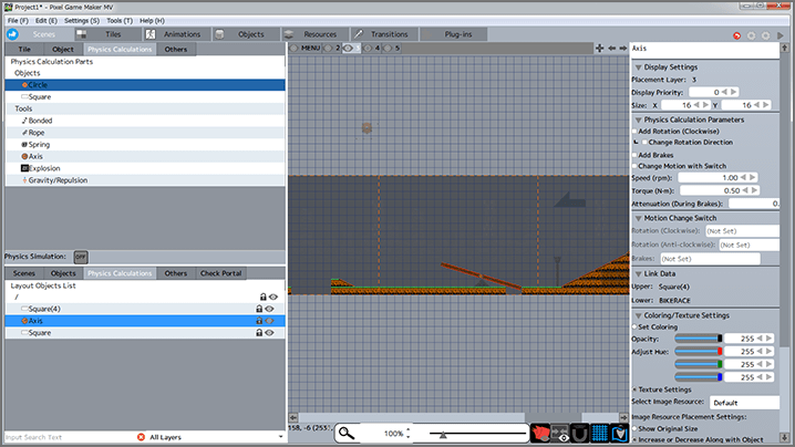 This program is packed with a variety of features, such as a graphics import function, screen and object rotation and scaling/zooming, multiple combined layer function, and particle effects. By putting them to good use, you should be able to simply and easily create the ideal game of your dreams.