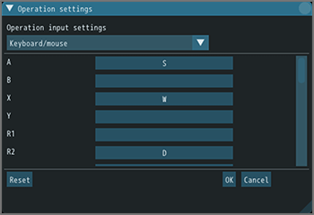 The various controls for games created using this program are given names based on the typical button names for each game controller. By going to "Settings" → "Control Keys Management", you can confirm whether each of the buttons, such as "A", "B", "X", "Y", "R1", "R2", "L1", "L2", "Direction Keys (Up, Down, Left, Right)", and commands, such as "OK" and "CANCEL", is responding to correct buttons (or keys), as well as change the settings.