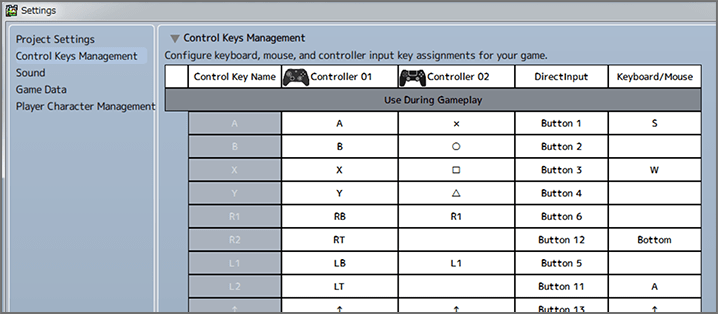 In-game controls and button (or key) responses for each device can be set for up to four devices. The "control key names" are fixed, so please double-click the button (or key) name fields for the four devices, and select the button (or key) that should respond to that name. You can also select the buttons (or keys) to set from a "Template", or use the control device currently in use to directly input and set controls.