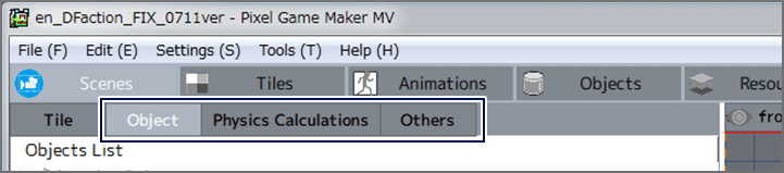 When tabs other than "Tile" are selected in the placeable parts list, you can place parts including objects or physics calculations in the scene. These parts will be added to the list of placed parts in the bottom left of the screen, where you can configure their detailed settings as necessary.