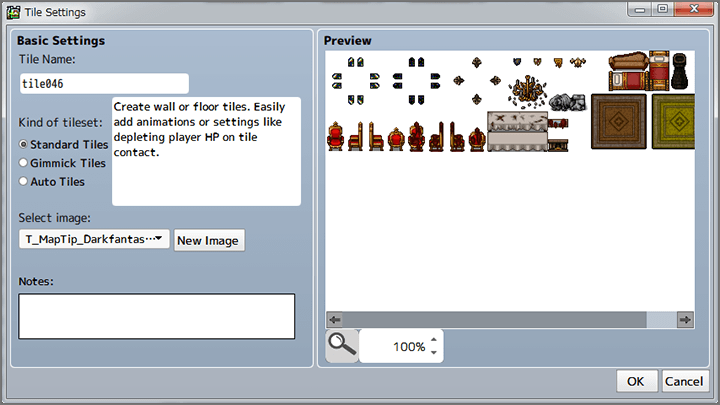 When adding a new tileset, a settings window will display when you select the menu button at the bottom of the tileset list or select "Create New Tile" from the context menu. After selecting a type of tileset from the three types, please select the image you wish to use. In the case of Auto Tiles, you can also select a plug-in you wish to use.