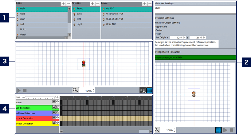 Display/Hide All DetectionSwitches between displaying and hiding wall detection, collision detection, attack detection, and connection points. You can switch between displaying and hiding individual detections in the timeline area.