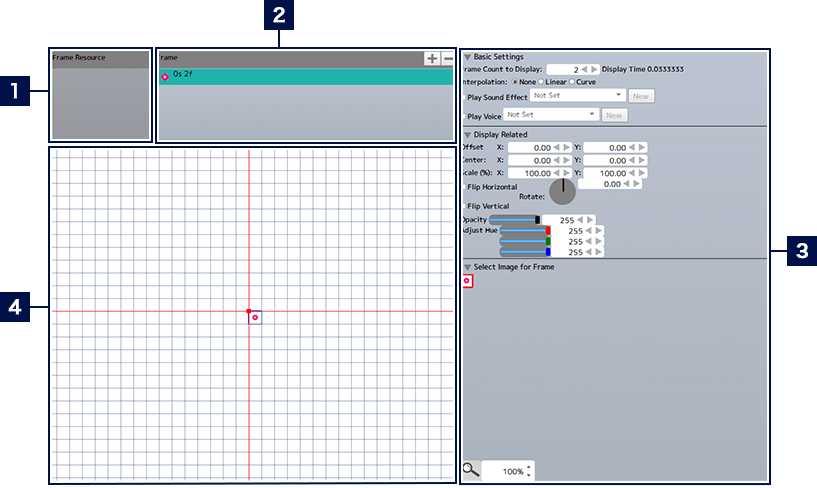 When an effects animation is selected in the animation list, the origin of each resource can be set in the detailed settings area. Also, when a "Displayed Frame Count" is set in the "Animation Playback Settings", the default frame count will be set to that value when adding new frames. You can also adjust the loop settings.