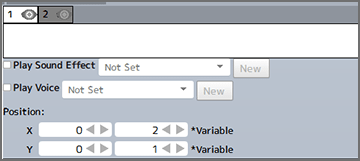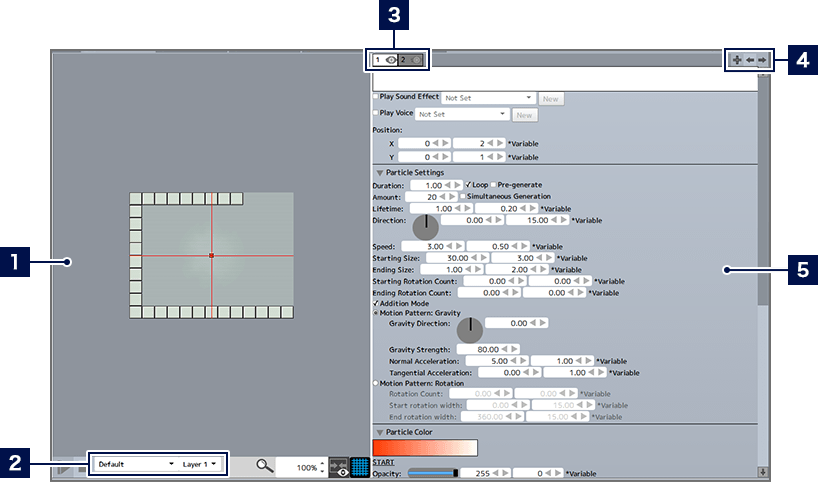 You can set the position and generation range for a particle under "Position" in the detailed settings area. Set the position (left-hand number) and range (right-hand number) based on the origin for both the X axis and Y axis. You can also set it up the same way by selecting the particle in the preview area and dragging. You can also set any SFX or voice clips to play while the particle is displayed.