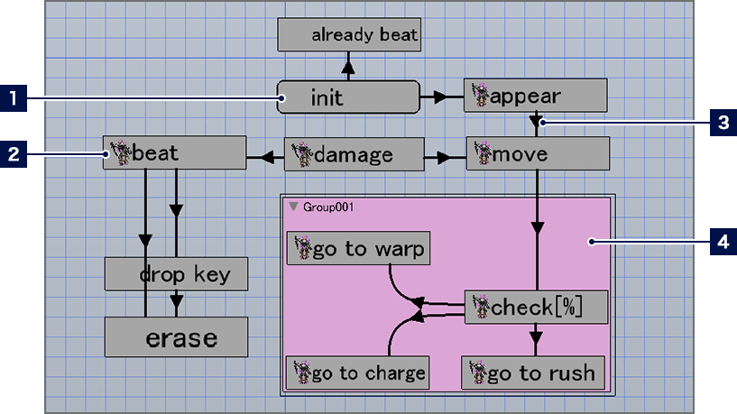 - The first action taken by an object placed in a scene will be displayed in a box with rounded corners. You can change the default action by selecting a box, right-clicking, and selecting "Set Default Action" from the context menu.