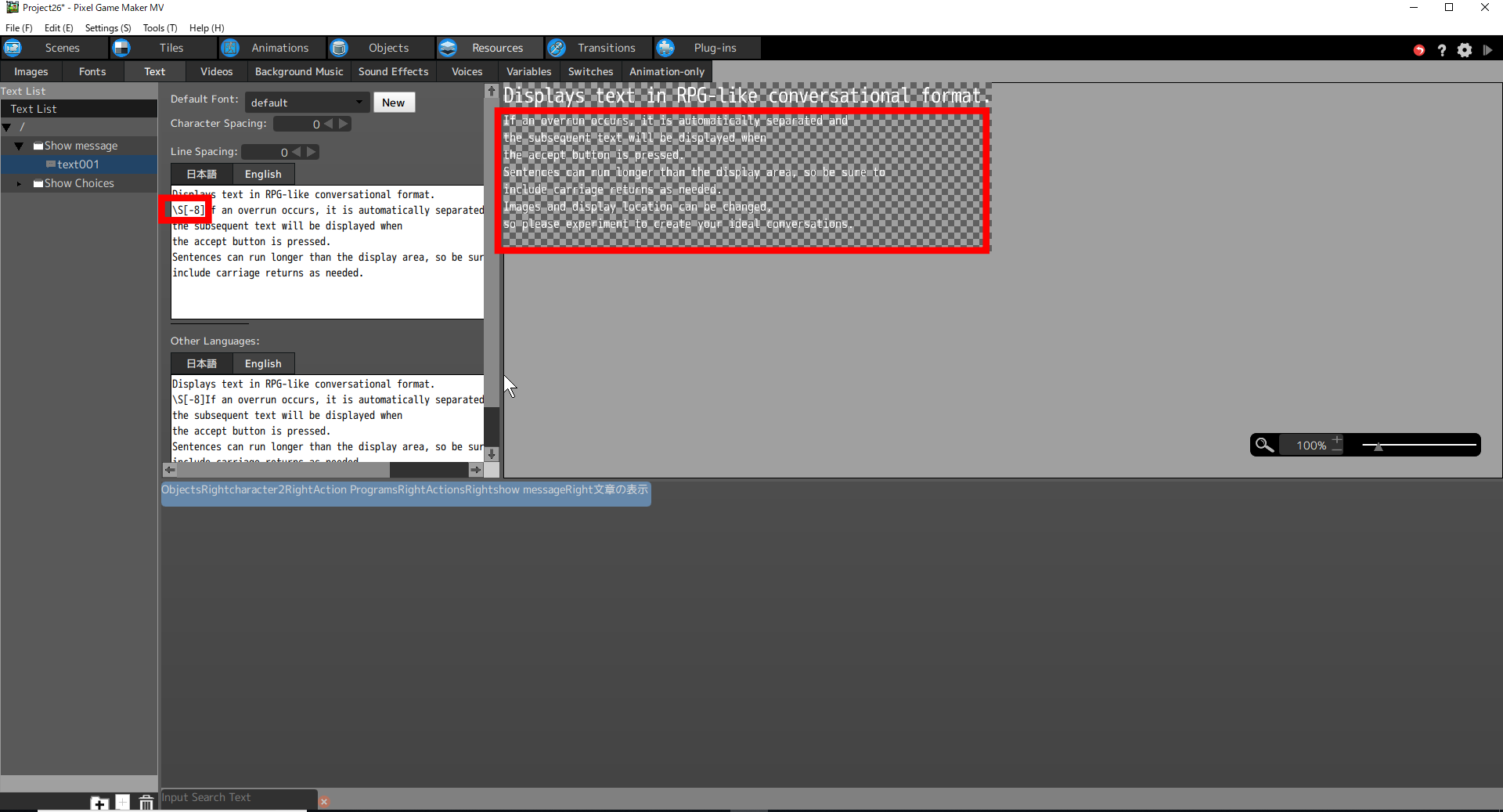In this screen, the font size is set to “-8” (the tag is \S[-8]). The font will be smaller starting from the position of the tag.