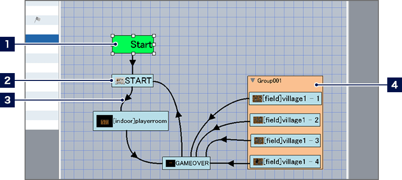 - In the flow chart area, you can check the relationships of each scene. You can scroll up and down using the mouse wheel, or hold down the mouse wheel and drag to scroll in all four directions.
