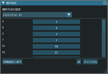 本ソフトで作成したゲームの各操作には、ゲーム用コントローラの一般的なボタン名に基づいた名称がつけられています。メニューバー「設定」→「操作キー管理」では、「A」「B」「X」「Y」「R1」「R2」「L1」「L2」「方向キー(上下左右)」「左スティック(上下左右)」「右スティック(上下左右)」の各ボタンと、「OK」「CANCEL」の操作に、それぞれどのようなボタン(キー)が対応しているかを確認・設定変更できます。