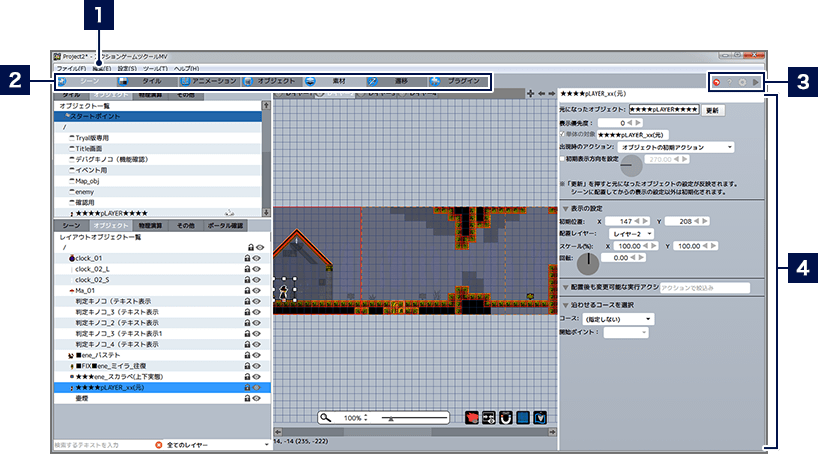 - ほとんどのツールではウィンドウ内が2~3つのエリアに分かれ、左端のエリアにはシーンやタイルなど、作成するものの一覧が表示されます。中央や右端のエリアには、一覧から選んだものの詳細情報や、詳しい設定項目などが表示されます。