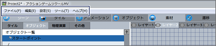 ほかのプロジェクトを開いたり、現在の進行状況を保存したりできます。新たなプロジェクトを開くときは、プロジェクトのフォルダ内の[Game](または[Game.pgmproject])を選びましょう。