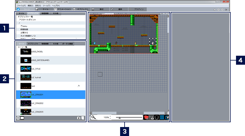 - シーン上に配置可能な、さまざまなパーツの一覧です。4つのタブをクリックして、カテゴリを切り替えてください。「タイル」カテゴリの選択中は、一覧の下部に編集ボタンが表示されます。