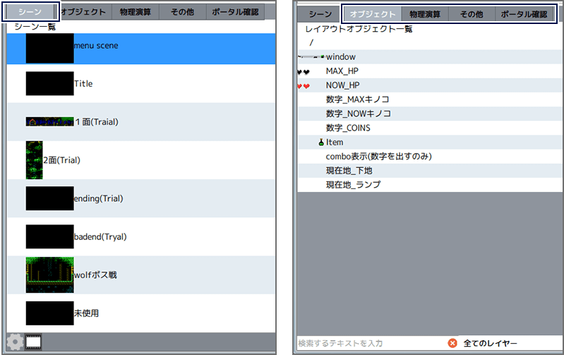 「シーン」以外の4つのタブを選択したときは、選択されたシーンに配置されている、タイル以外の各パーツを一覧で確認できます。また、「ポータル一覧」では配置されているポータルを確認したり、設定を変更したりできます。一覧の下部にある検索ボックスやプルダウンメニューを利用すれば、表示する項目の絞り込みができます。