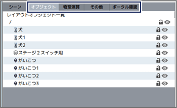 タブ「物理演算」を選ぶと、配置した物理演算用パーツを一覧で確認し、選んだものを編集したり詳細設定を行ったりできます。