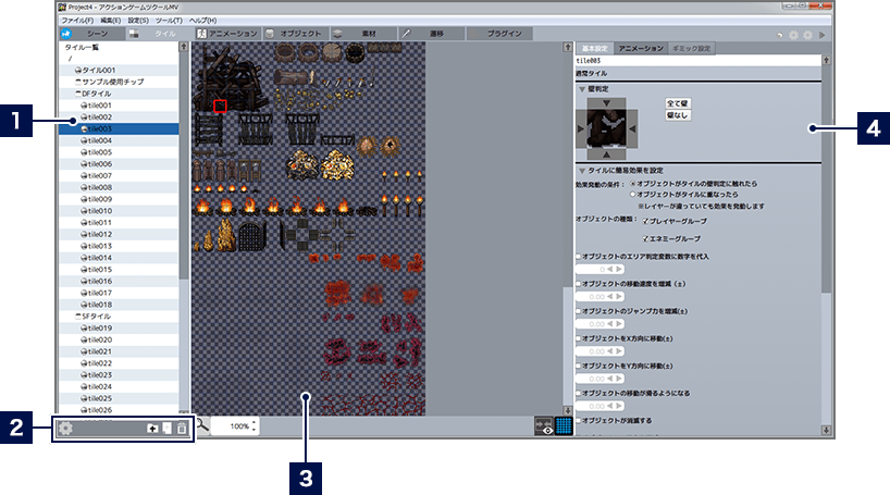 ゲームの舞台となるフィールド(いわゆるマップ)は、「タイル」と呼ばれるパーツを組み合わせて作成します。ツール「タイル」では、タイルに用いる画像や、各タイルの壁判定(通り抜けの可否)、アニメーション、キャラクターが接触したときの効果など、さまざまな要素を管理できます。