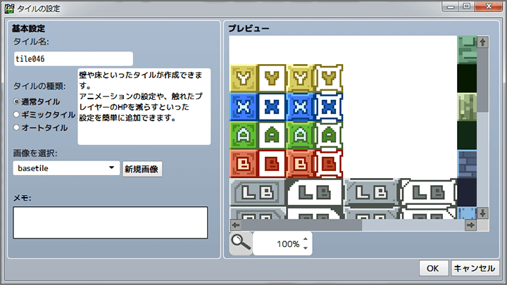 | 通常タイル | 壁や床などを作成できる、オーソドックスなタイルです。 |
