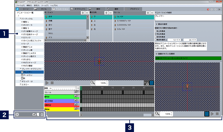 モーションアニメーションには、画像素材やgifアニメーションなどをベースにして、さまざまな動きを設定できます。また、当たり判定や攻撃判定などの指定も行えます。