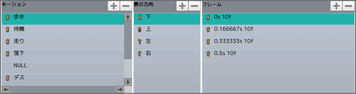 オブジェクトの見た目上の動き(モーション)を、モーションアニメーションと呼びます。操作キャラクターや敵、アイテム、各種ギミック、表示物(UI)など、シーン内に配置されている、タイル以外の大部分のアニメーションはここで管理されます。