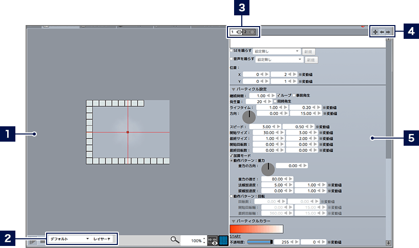 - 1つのパーティクルアニメーションには、複数のパーティクルを配置することが可能です。パーティクルは1つのレイヤー(階層)に1つ設定が可能です。また、左側にあるレイヤーほど、上の階層になります。タブをクリックすると、選択するレイヤーを切り替えられます。