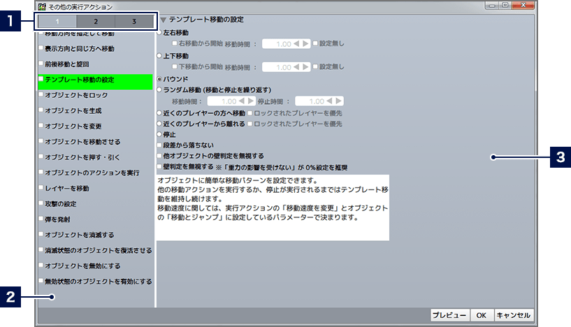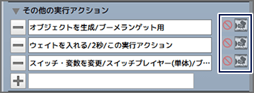 | クリックしてOFFにすると、オブジェクトはそのアクションを実行しません。この設定は実際のゲーム中にも適用されます。 | |