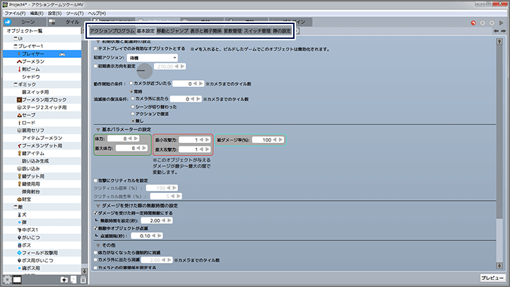 ここでは、オブジェクトが子プロジェクトになったとき、親から引き継ぐ要素や移動、被ダメージのルールなどを設定できます。