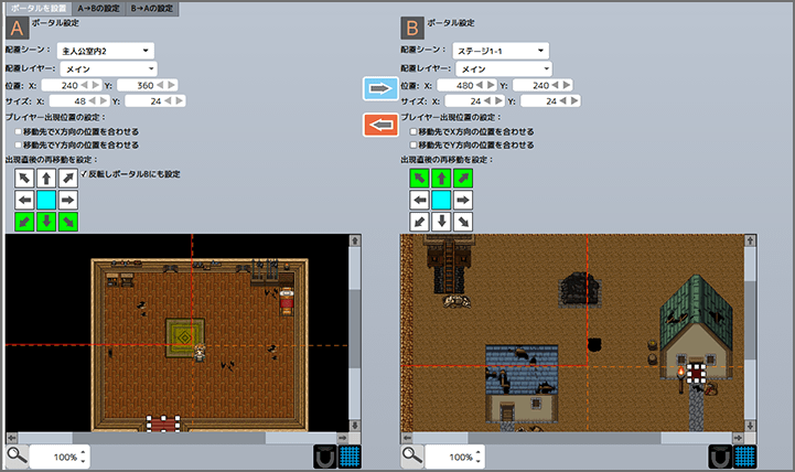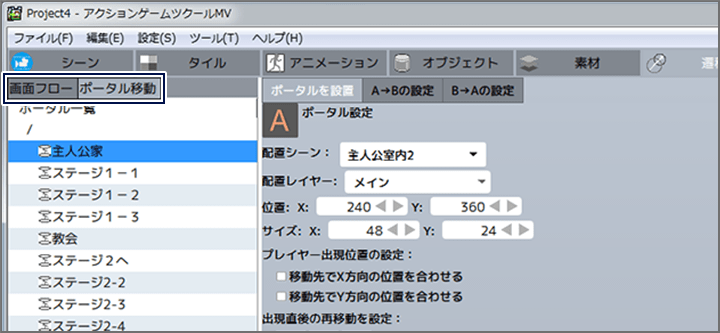 ツール「シーン」で作成された、さまざまなシーンをつなぎ合わせるツールが「遷移」です。ここでは「画面フロー」と「ポータル移動」の設定が行えます。ツール選択メニューで「遷移」を選び、タブをクリックして2つの画面を切り替えましょう。
