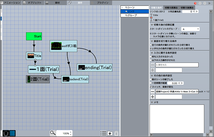 「画面フロー」では、シーンからシーンに遷移するフローや、遷移するための条件などを、フローチャート形式で設定できます。タイトル画面からステージに進む際の遷移や、ステージクリアのあと次のステージに進む遷移、ゲームオーバー時の画面遷移などは、「画面フロー」で設定するといいでしょう。