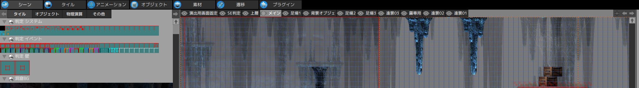キャラクターなどゲームの基本となるオブジェクトを管理するレイヤーです。壁判定もここに配置します。 - 足場とその他