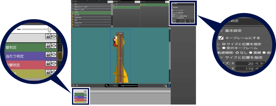 下部のタイムラインで判定を追加したいフレームを選択し、判定の設定項目でサイズや位置を設定しましょう。