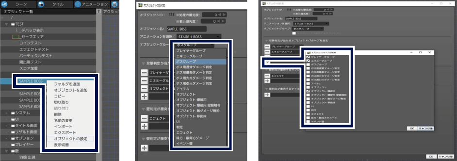 次に、オブジェクトに判定を設定していきます。 設定したいオブジェクトを選択して右クリックメニューからオブジェクトの設定を選択します。 オブジェクトグループからグループを選択し、このオブジェクトがどのグループに属しているかを設定します。 攻撃判定が当たるオブジェクトグループでは、このオブジェクトの攻撃判定が当たるオブジェクトグループを選択します。 プレイヤーと敵であれば、お互いを選択している必要があります。
