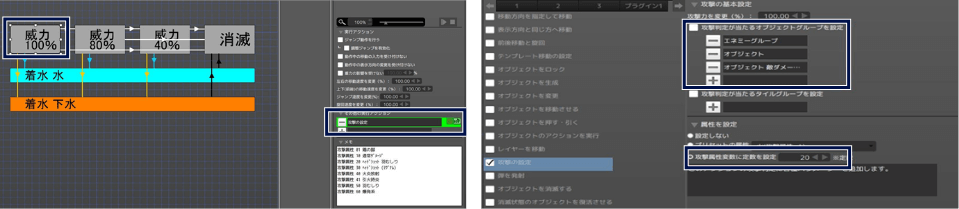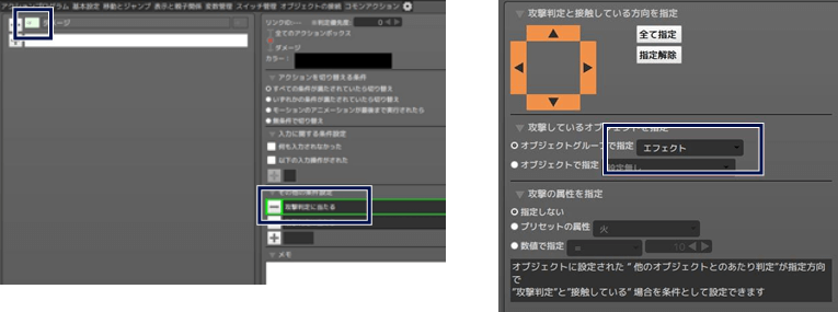 攻撃の基本設定でこの攻撃判定がどのような効果を持つのかを設定します。オブジェクトの設定とは別に、ここでもオブジェクトグループを制御することもできますが、管理が難しくなるためあまりお勧めはしません。