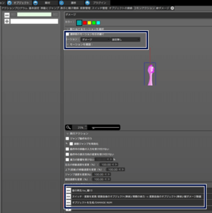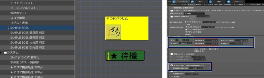 ダメージ処理を設定する前に、オブジェクトの基本設定でオブジェクトの体力など設定します。 体力、攻撃力はその名の通りです。 被ダメージ率は攻撃に対するダメージの軽減率ですが、今は100%にしておきましょう。 ダメージを受けた時一定時間無敵にするという項目で、ダメージを受けた際の無敵時間を設定しておきます。 攻撃判定が接触している間、常にダメージが有効になるのを防ぐ役割を持っている重要な設定です。