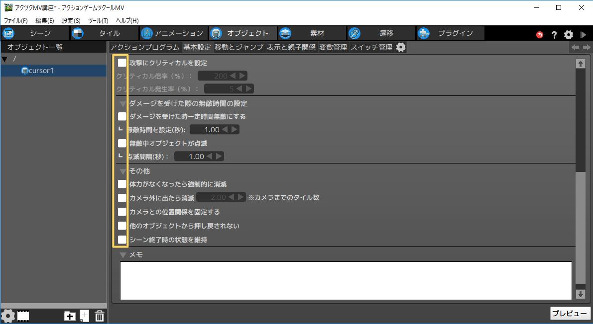 - これでオブジェクトの設定は完了です。続いてアクションプログラムを作っていきます。
