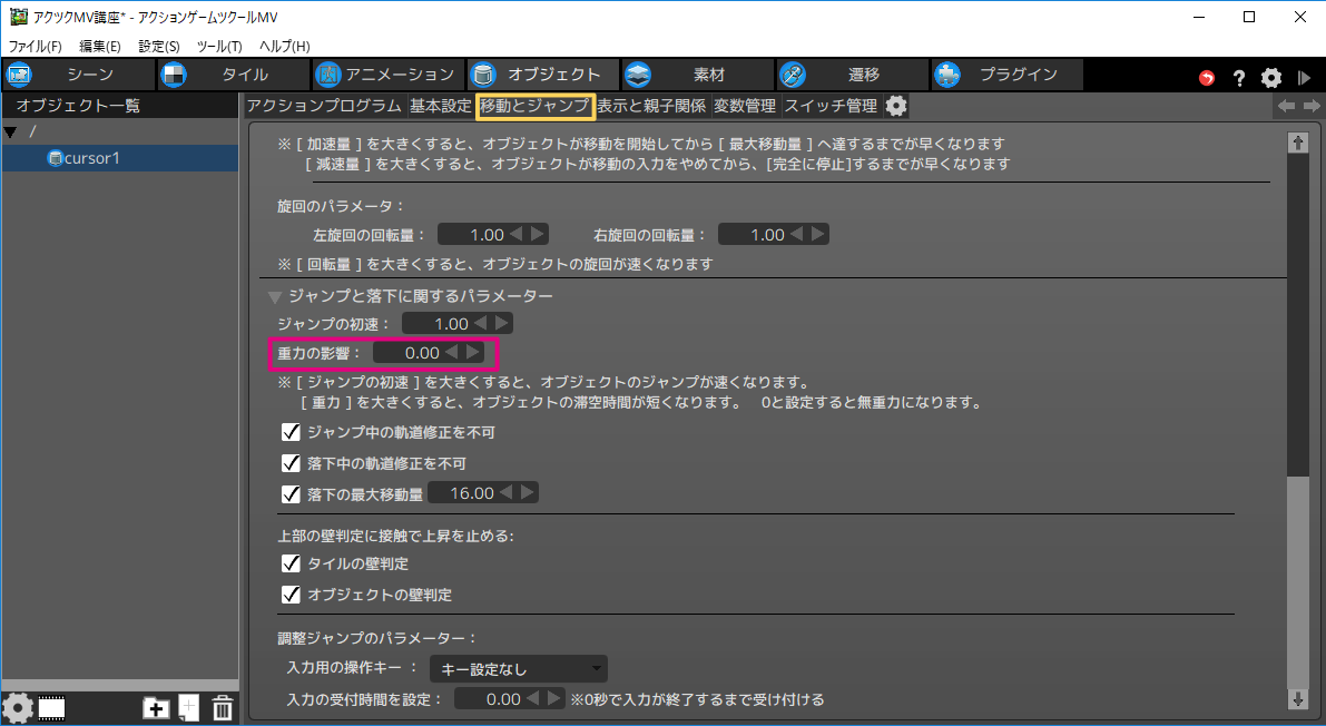 ※アクションプログラム側でも「重力の影響を受けない」設定があります。 個別に設定するのは面倒なので、こちらで設定しましょう。 - 4[移動とジャンプ]をクリックします。