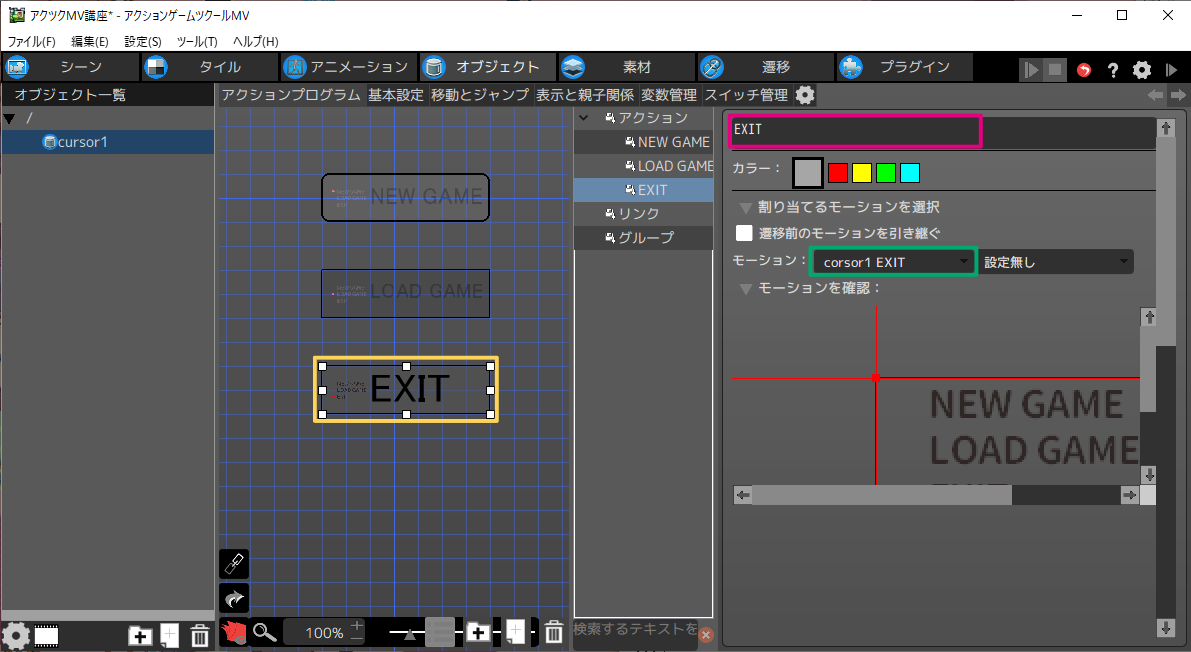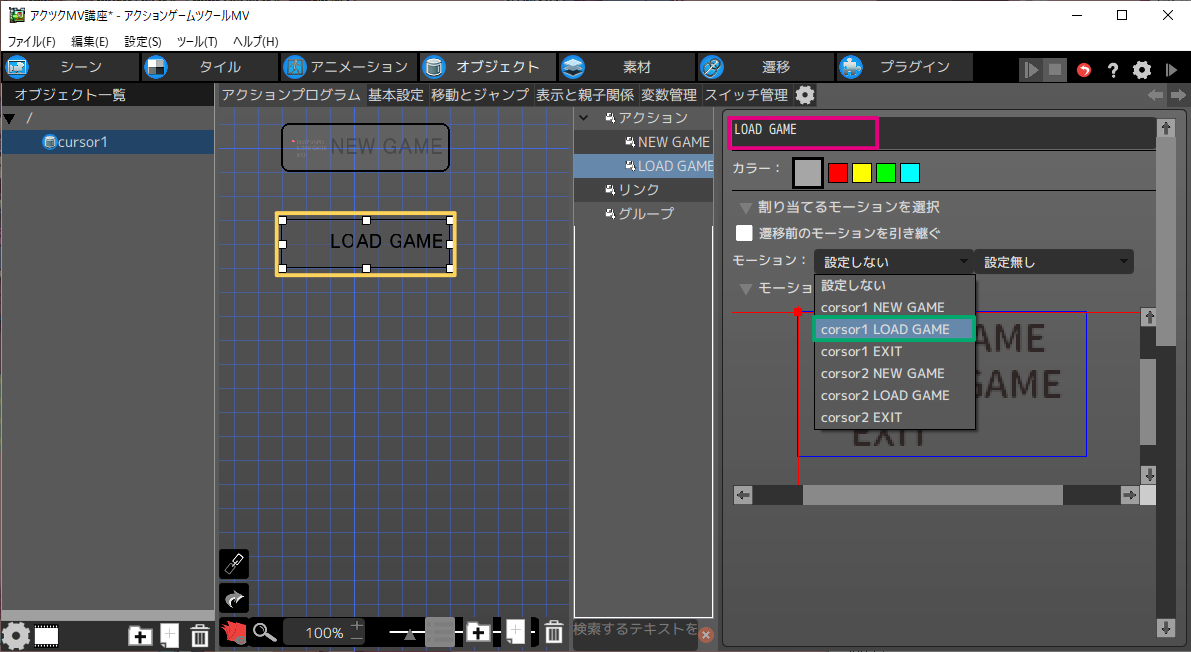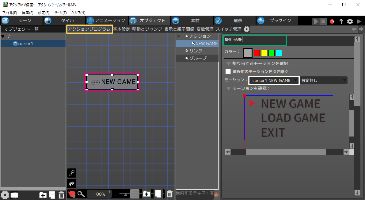- 4「モーション」のプルダウンをクリックし、カーソルが一番上のモーションを選択します。ここでは[corsor1 NEW GAME]を選択しております。