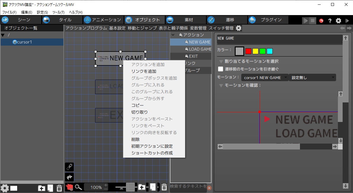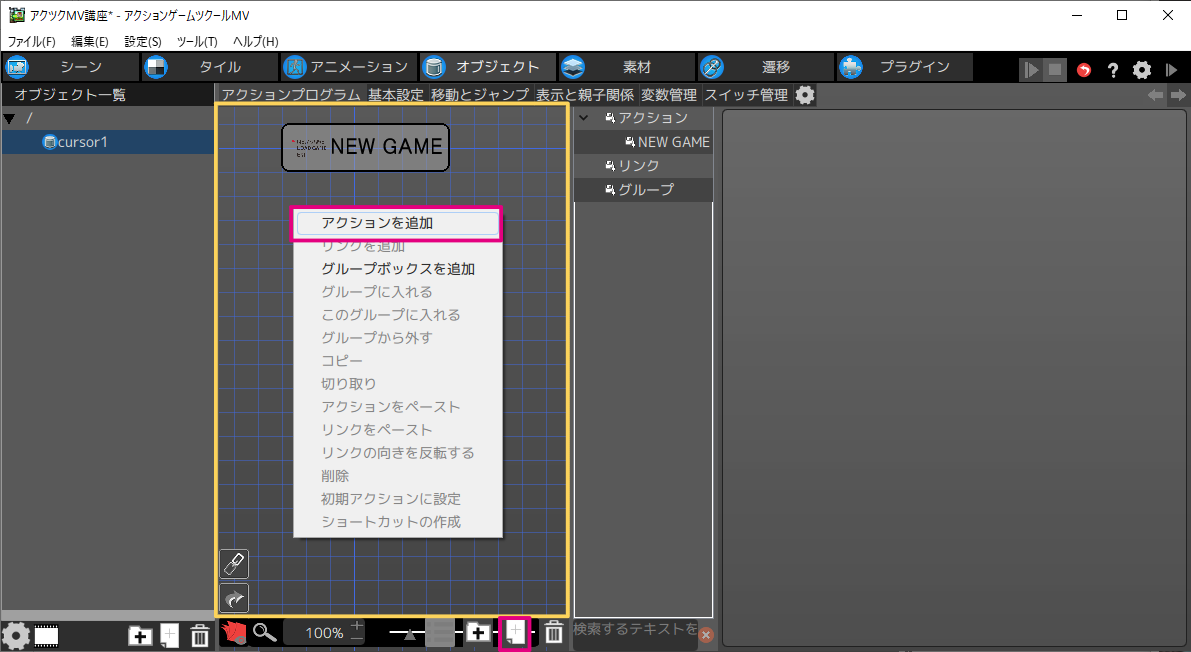 - 1リンク元となるアクション(ここではNEW GAME)を右クリックし、[リンクを追加]をクリックします。