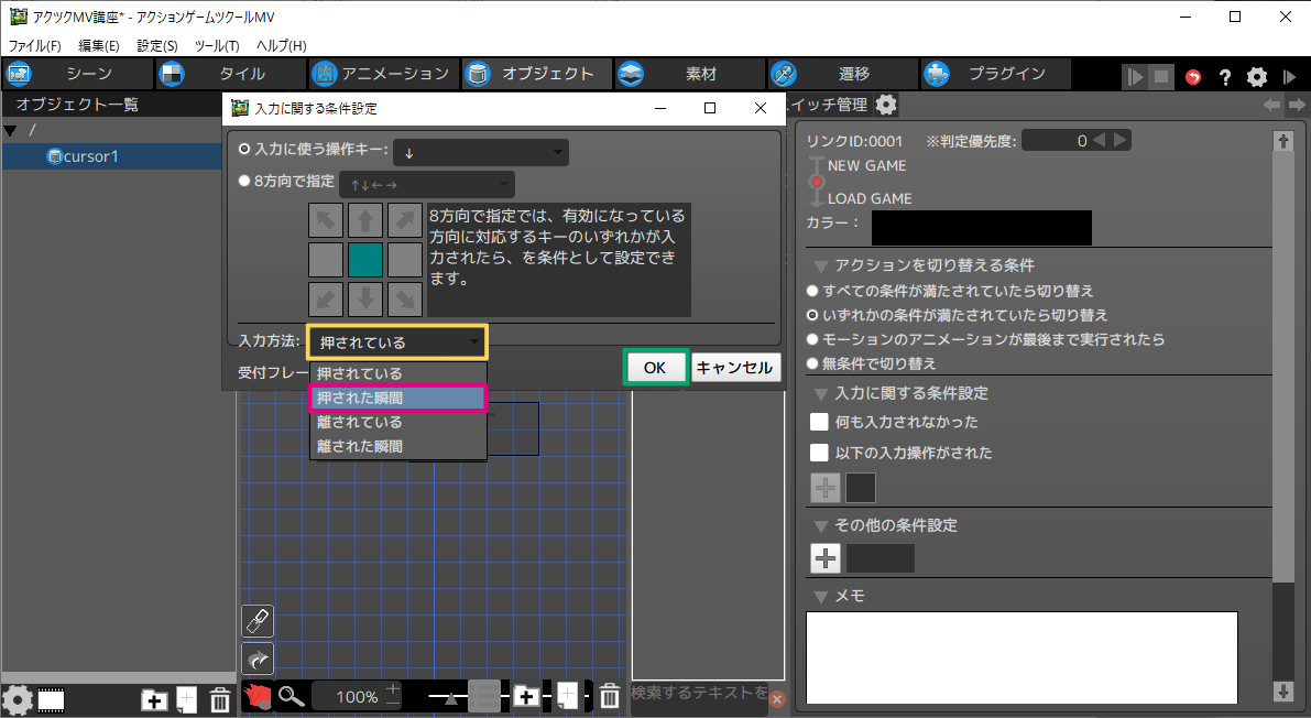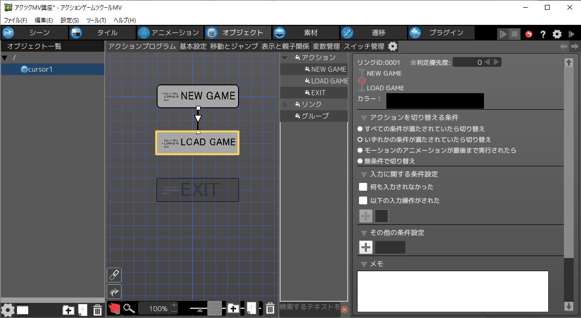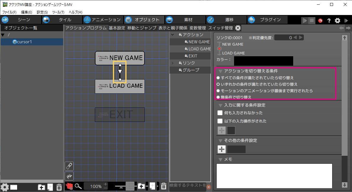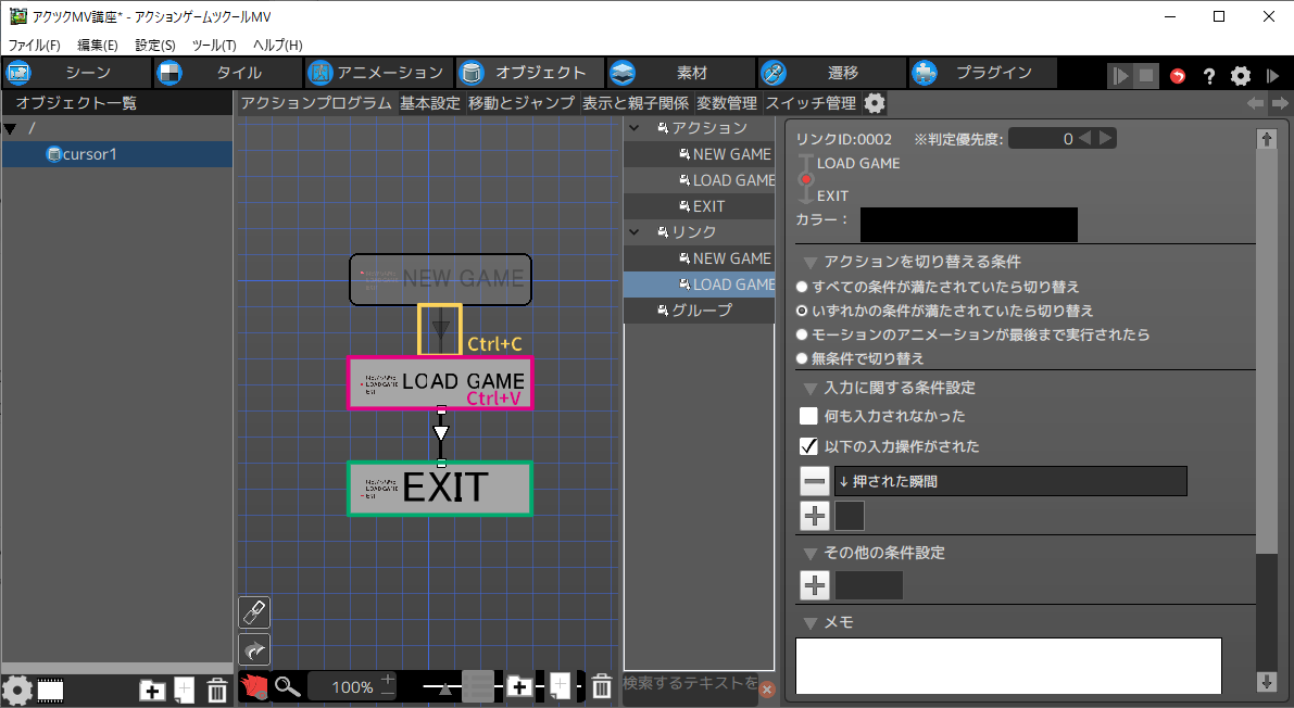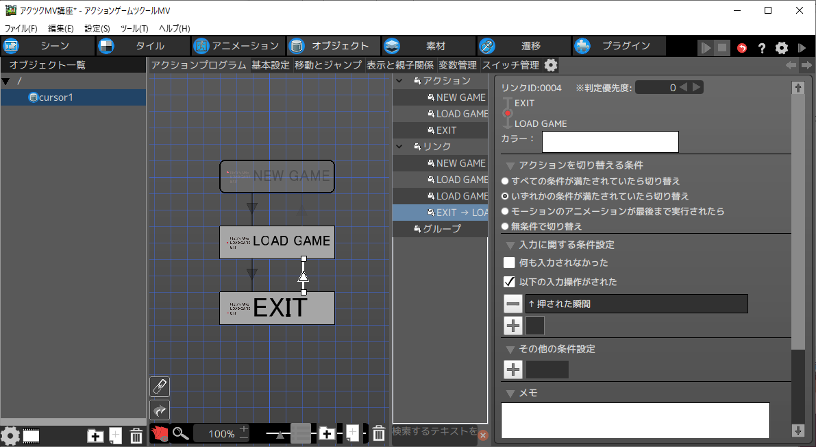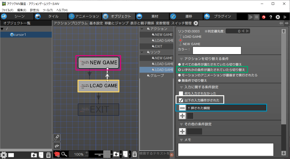例えば、今回のカーソル移動の場合、[NEW GAME]⇒[LOAD GAME]⇒[EXIT]のリンク条件を「↓を押されている」にすると、[LOAD