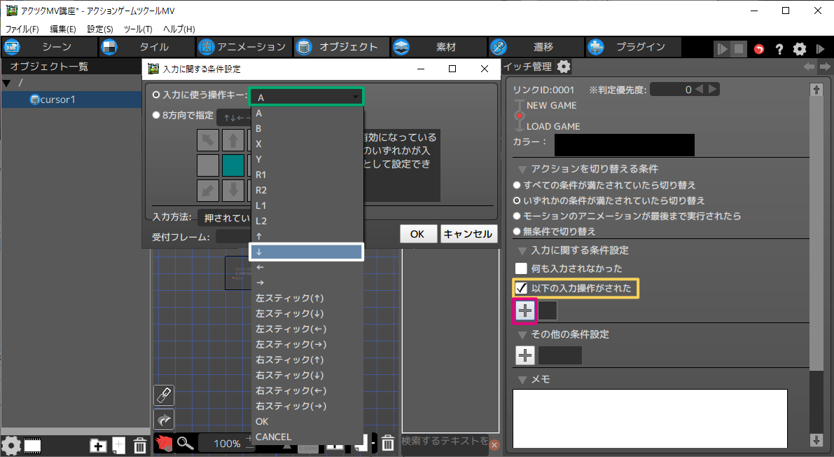 次に、作成したアクションをリンクでつなぎます。 まずは↓ボタンを入力したら、カーソルが移動するような条件を追加していきます。
