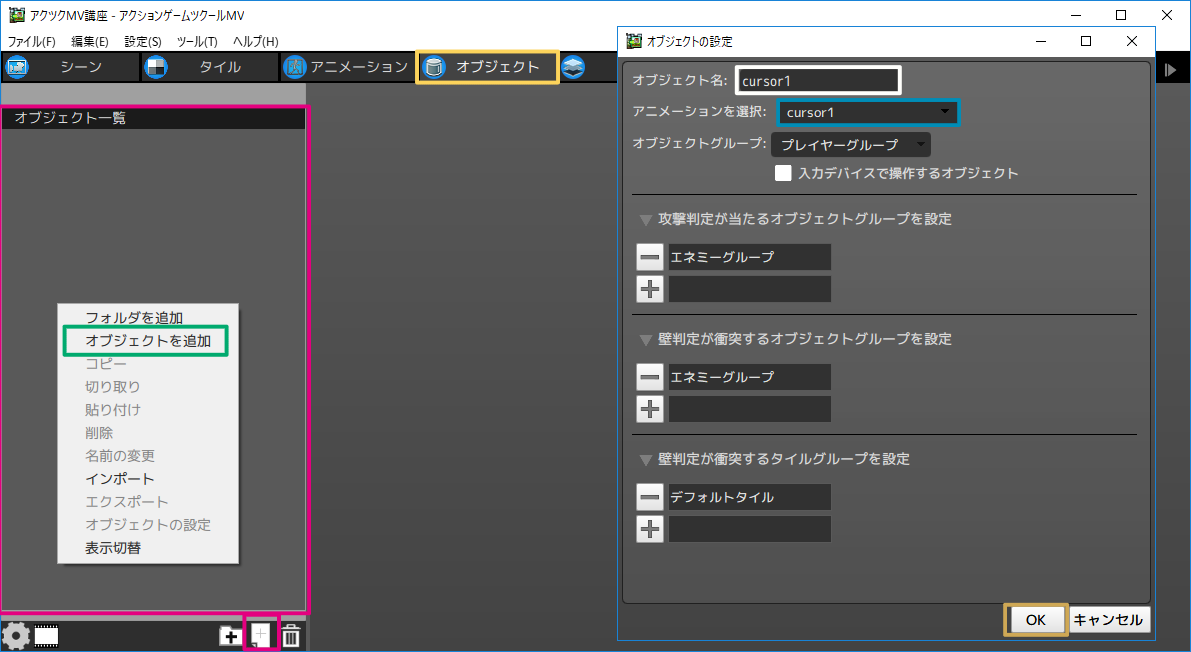 - 2「オブジェクト一覧」枠内を右クリックし、[オブジェクトを追加]をクリックします。