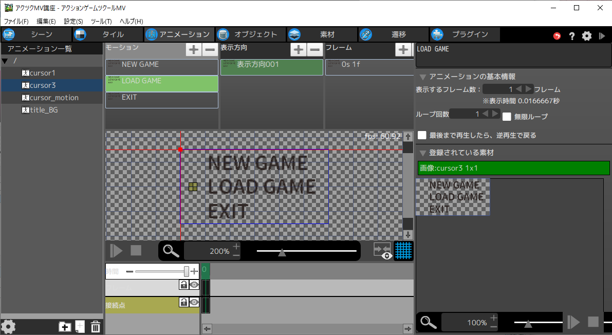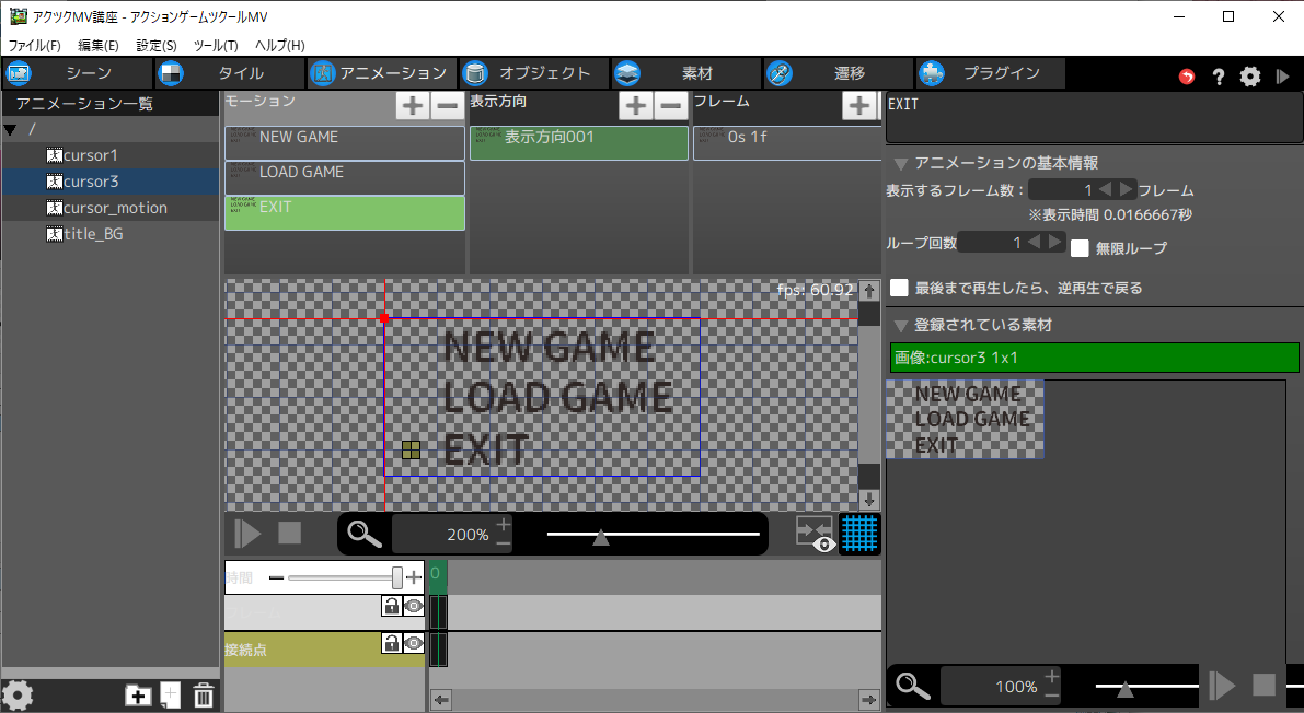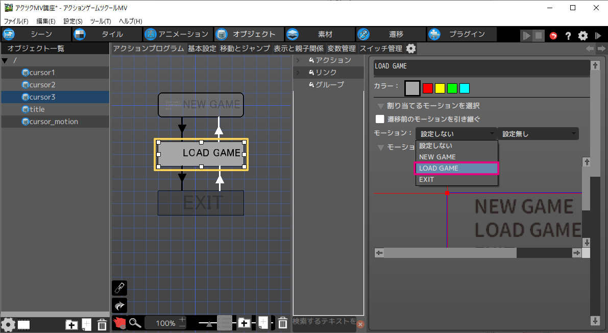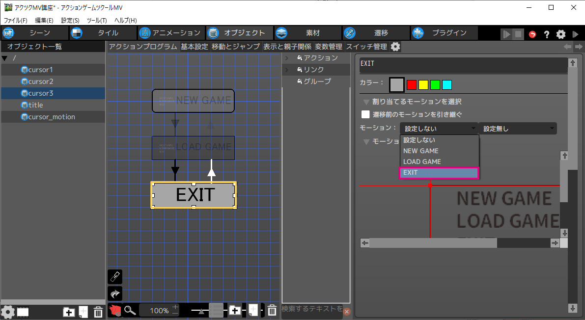 はじめに「NEW GAME」「LOAD GAME」「EXIT」の3つのモーションを作成します。