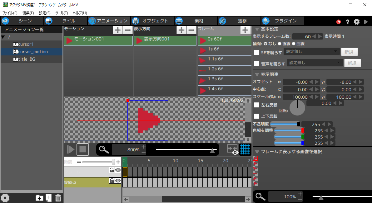 - 4アニメーションを選択のプルダウンをクリックし、カーソルのアニメーション(cursor_motion)を選択します。