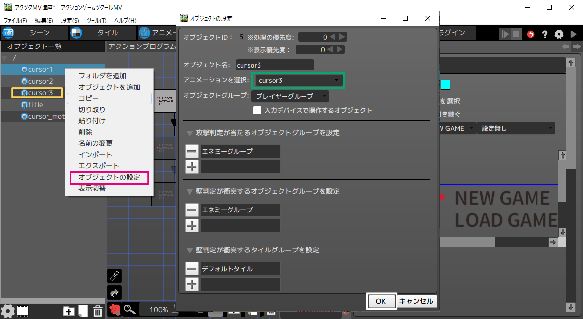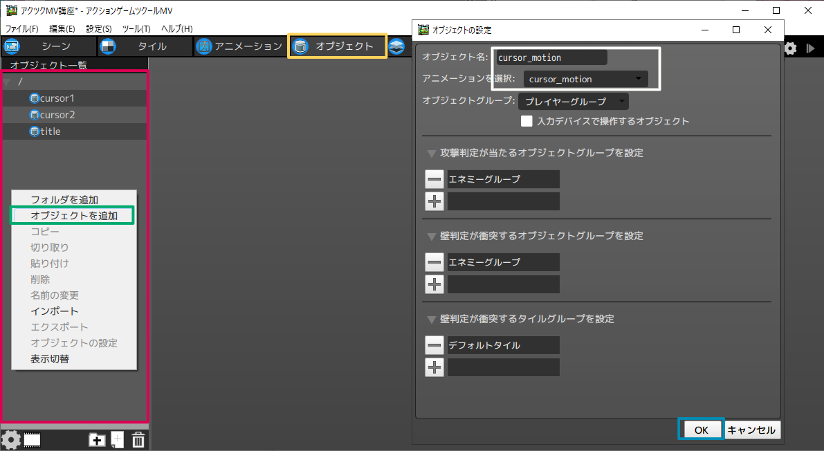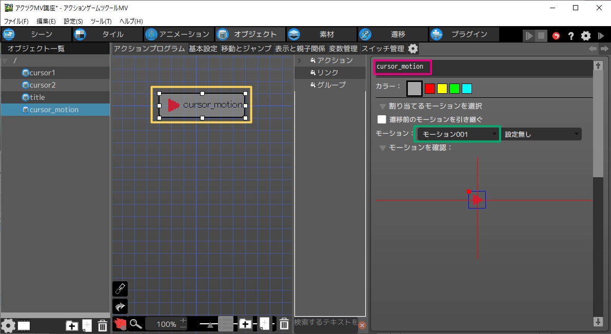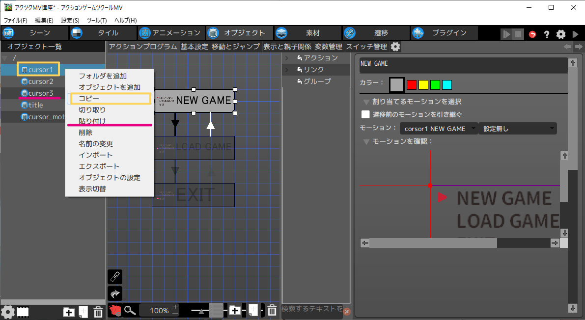 ※オブジェクトはコピーして流用することも可能です。cursor1をコピーして、モーションを変更する方法を説明します。