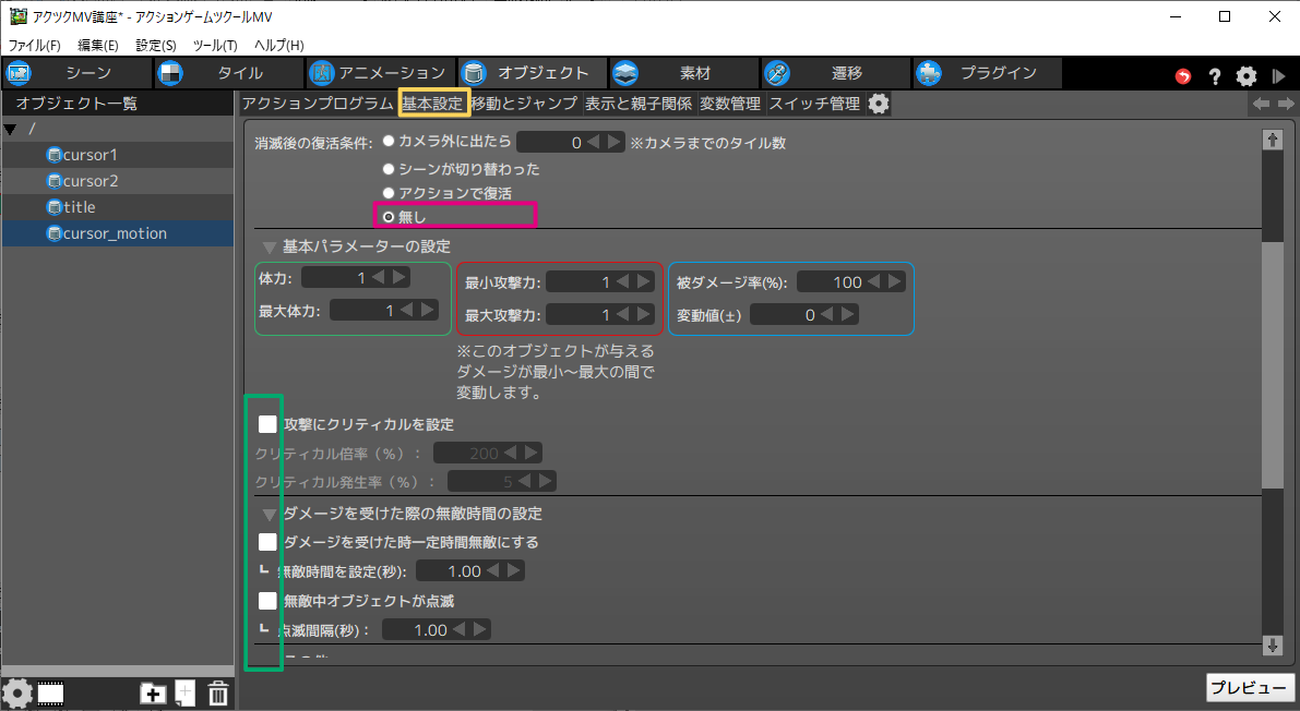 - 3「攻撃にクリティカルを設定」「ダメージを受けた時一定時間無敵にする」「無敵中オブジェクトが点滅」のチェックを外します。