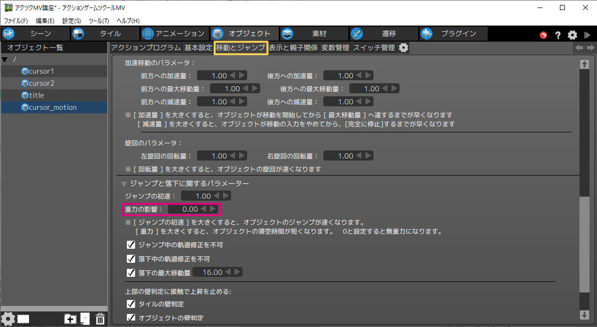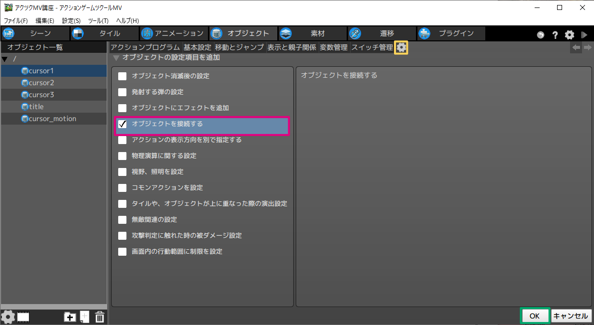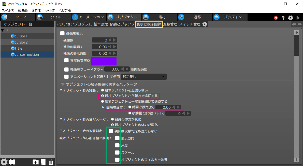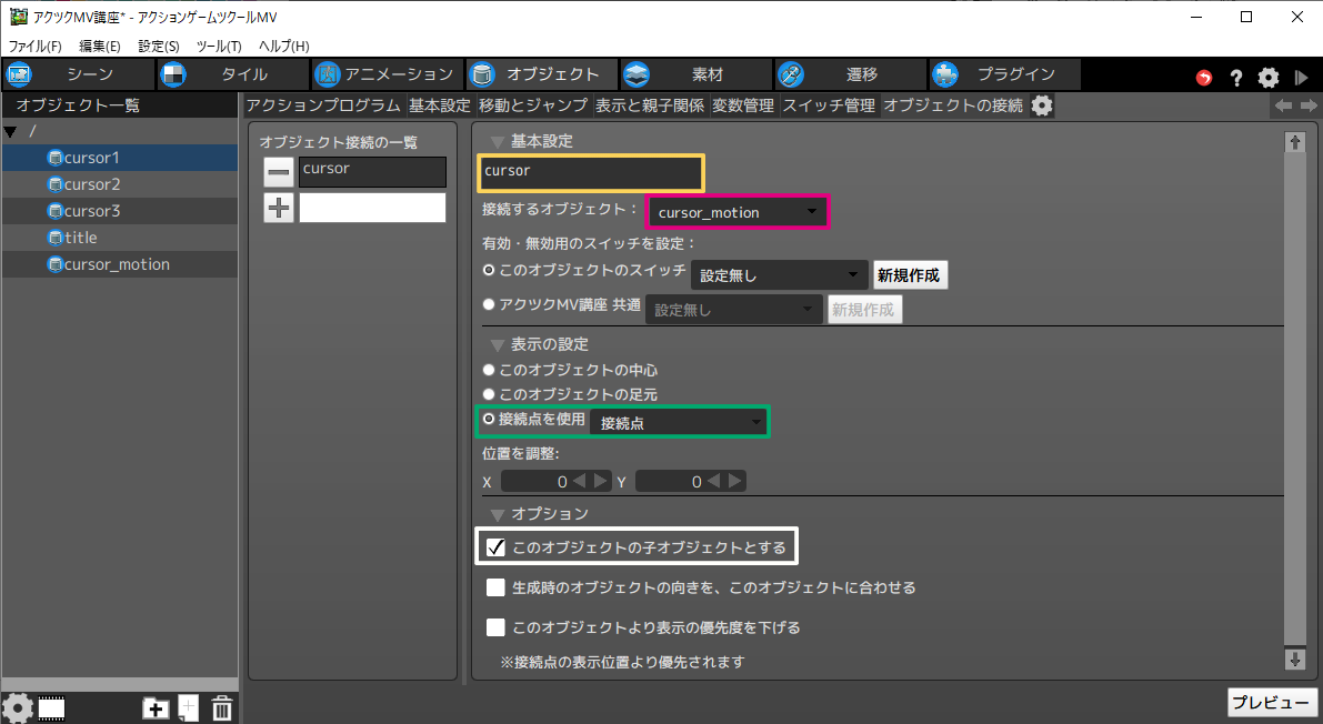 - このチェックを入れることで、cursor_motionオブジェクトがこのオブジェクトの子オブジェクトとして扱われます。子オブジェクトに設定すると、[表示と親子関係]の設定が反映され、接続点に追従するようになります。