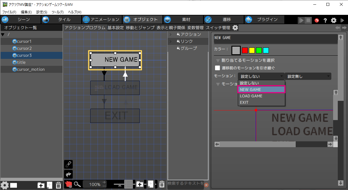 - 1[NEW GAME]アクションをクリックし、モーションを変更します。