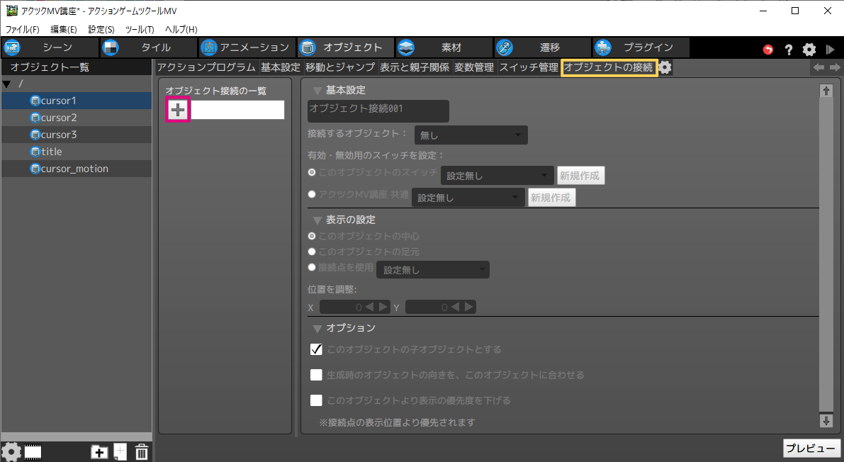 - 2オブジェクト接続の一覧の[+]ボタンをクリックします。